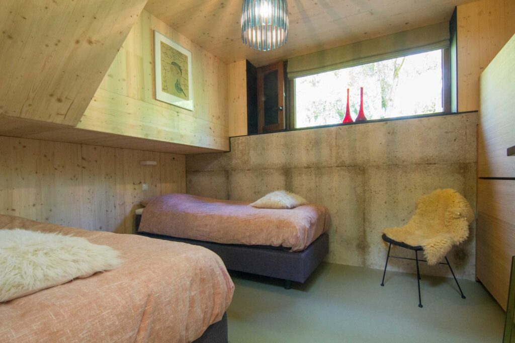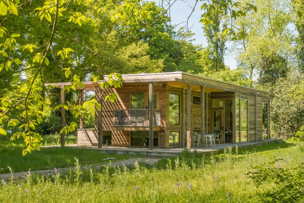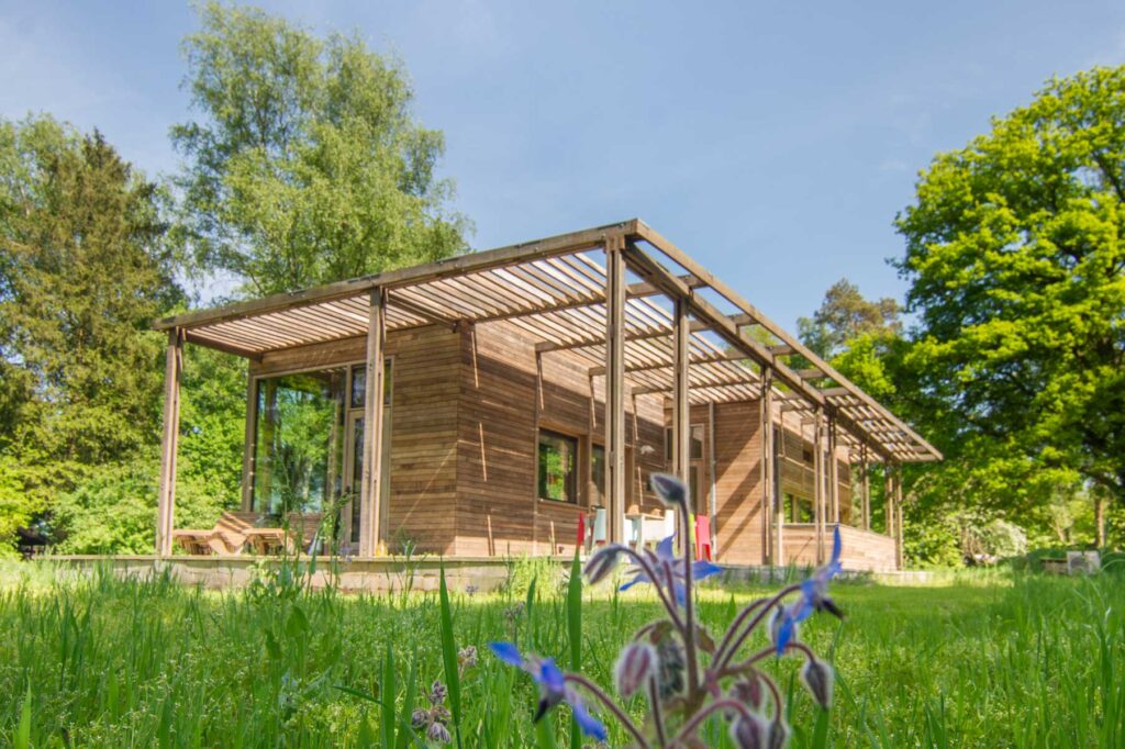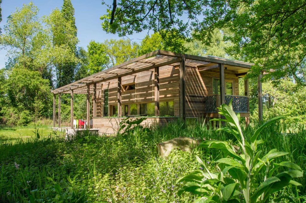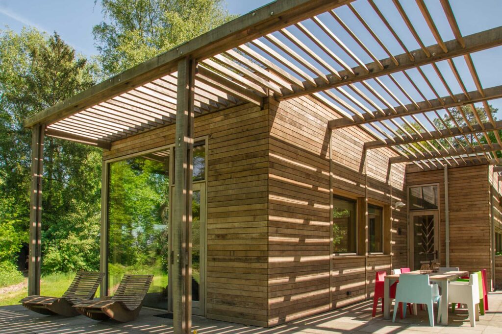 Paviljoen Esch is een stijlvol eco vakantiehuis in Aalten. Paviljoen Esch is biobased en circulair gebouwd. Boven de grond is het paviljoen volledig van hout met nergens een stalen balk. Als één van de eerste woningen in Nederland heeft Paviljoen Esch een kelder en vloer van duurzaam cementloos beton, met een tot 80% lagere CO2-uitstoot. Voor het beton zijn circulaire isolatieplaten gebruikt, van onder een ijsbaan. De constructie is van Duits massief vurenhout, de CLT panelen zijn in een fabriek verlijmd en op maat gezaagd. De wanden zijn geïsoleerd met houtvezels. De kozijnen, gevelplanken en de pergola zijn van ongeschilderd duurzaam fraké hout.